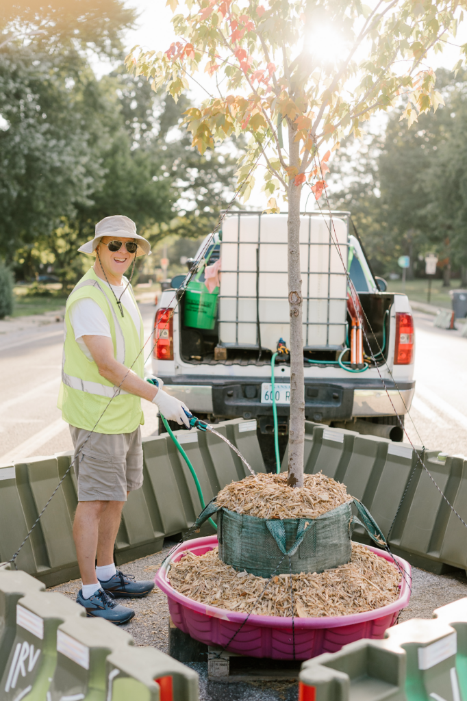 Residents from Community Heights and Irvington organized to make changes. Through grants and other fundraising, they raised $150,000 for traffic calming installations in the neighborhood. The 10th Street installation cost around $80,000. They worked with Indy DPW to install around 300 water barriers (eight feet long and 18-inch wide) and street trees in the center of the street and on the sides. Leslie Schulte, former leader of the Community Heights Neighborhood Organization, describes a great partnership with Indy DPW. She says she knew almost nothing about tactical urbanism at the beginning, but Indy DPW helped them find a strategy to meet their goals. They also provided training in other aspects such as conducting surveys and speed studies.