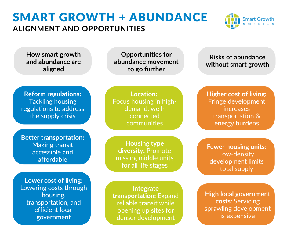 The ‘abundance’ movement is gaining momentum: it’s a big idea that calls for building more housing, more energy, and more infrastructure by getting rid of outdated and unnecessary red tape. Abundance is a great idea, and Smart Growth America is ready to offer our decades of experience and expertise, not only in seeking those same outcomes, but in demonstrating what it looks like when those big ideas are put into action.