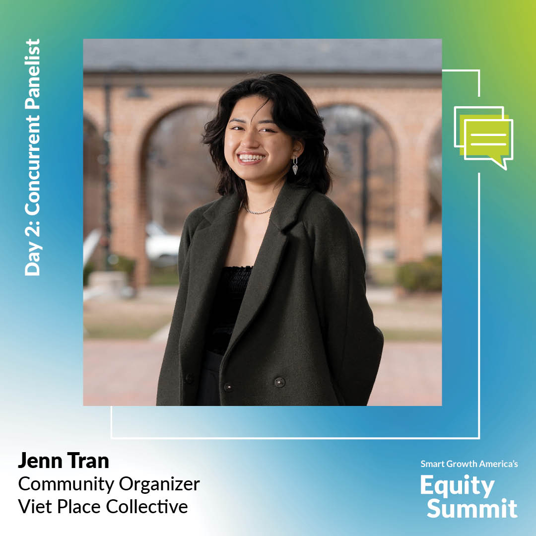 Jenn Tran is an architecture & planning professional and community organizer with Viet Place Collective. Jenn works in the Vietnamese diaspora community of Falls Church, VA to advocate for immigrant businesses and combat gentrification and cultural erasure. She is committed to addressing inequity in the built environment and re-envisioning how land development distributes wealth in communities. She believes in building agency within post-war communities and celebrating the resilience of a people who have thrived against direct and systemic violence. Viet Place Collective is supporting the immigrant businesses of the Eden Center in Falls Church through impending development. We hope to minimize commercial displacement and maintain the strong cultural and communal nature of Eden Center.