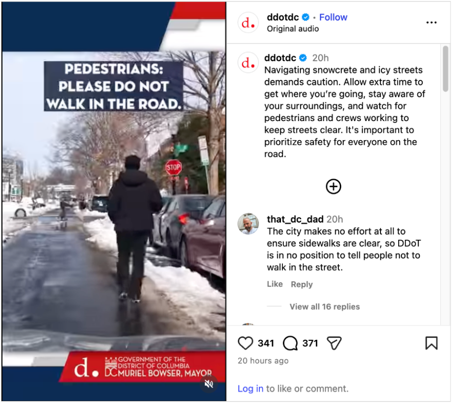 SGA’s experience with transportation safety and walkability has taught us that people aren’t dumb. They will walk or move in the places and ways that are safest and most accessible for them. If folks are in the street, it is most likely because that is their only option. It is a symptom of decisions and practices from decision-makers at DPW, DDOT, and elsewhere. Rather than blaming pedestrians for trying to reach their destinations, the city should prioritize clearing the snow and ice for all people, no matter how they get around.