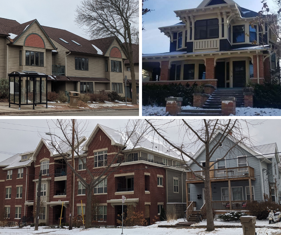 Sound idyllic and impossible today? It shouldn't be. My current neighborhood in Madison, WI—a medium-sized, growing, thriving city—feels similar to my childhood hometown with an array of housing choices. On my block there are a couple of duplexes, a three flat (aka triplex), and one brick building with six apartments mixed with single-detached homes of various sizes. Mine is a very small one (pictured up top), not much bigger than a two-bedroom apartment, but with a basement, attic, front porch, and back yard. I'm living there by myself, so I don't need or want more than that. The next block over there are some larger apartment buildings, and within a short walk I can reach a couple of condo buildings and big, old historic homes. There are residential options for students, empty nesters, and yes, families.