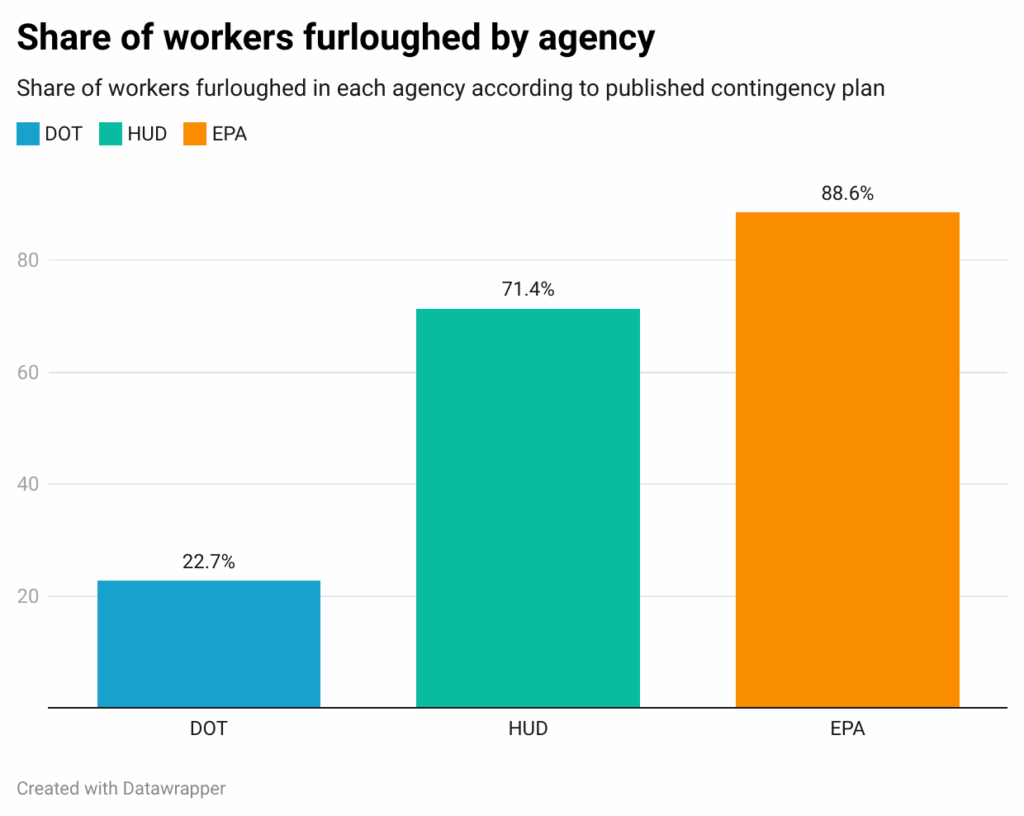 As the RIFs are announced, furloughs across much of the government continue, grinding basic operations of many agencies to a standstill. Government functions that rely on annual appropriations—such as the vast majority of HUD, EPA, and the Department of Commerce staff—are those facing the heaviest disruptions in terms of furloughed personnel, while those predominantly not funded through that process–such as the Federal Highway Administration (FHWA) and the Federal Housing Finance Agency (FHFA)—weather the storm in much better positions, at least initially. Individual agencies have provided contingency plans that detail their plans for a shutdown as well as current staffing levels. These contingency plans provide insight into how many staffers will continue to work during the shutdown and what functions will continue. The chart below details the share of workers furloughed at each agency if they fully implement their shutdown plan as written (not accounting for recently announced RIFs).