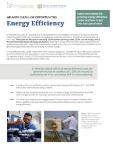 These factsheets support Atlanta’s current and future workers’ access to the growing clean economy. The continued expansion of the clean economy in Atlanta represents a significant opportunity for the creation of entry-level jobs with upward mobility potential for individuals that have been historically excluded from pathways for wealth-building.