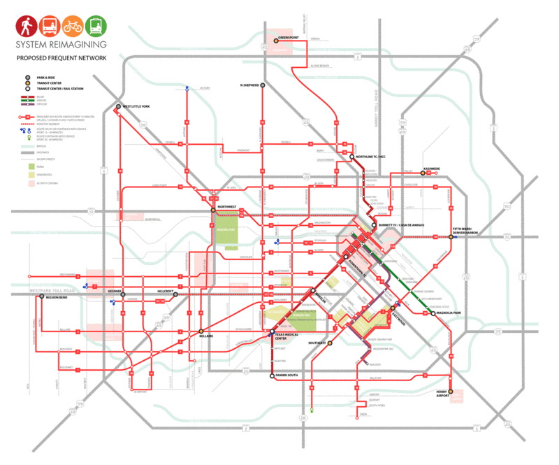 The increase in high-frequency coverage is so revolutionary that the change easily be seen on a map. The maps below show Houston’s high-frequency routes in red before and after the change.