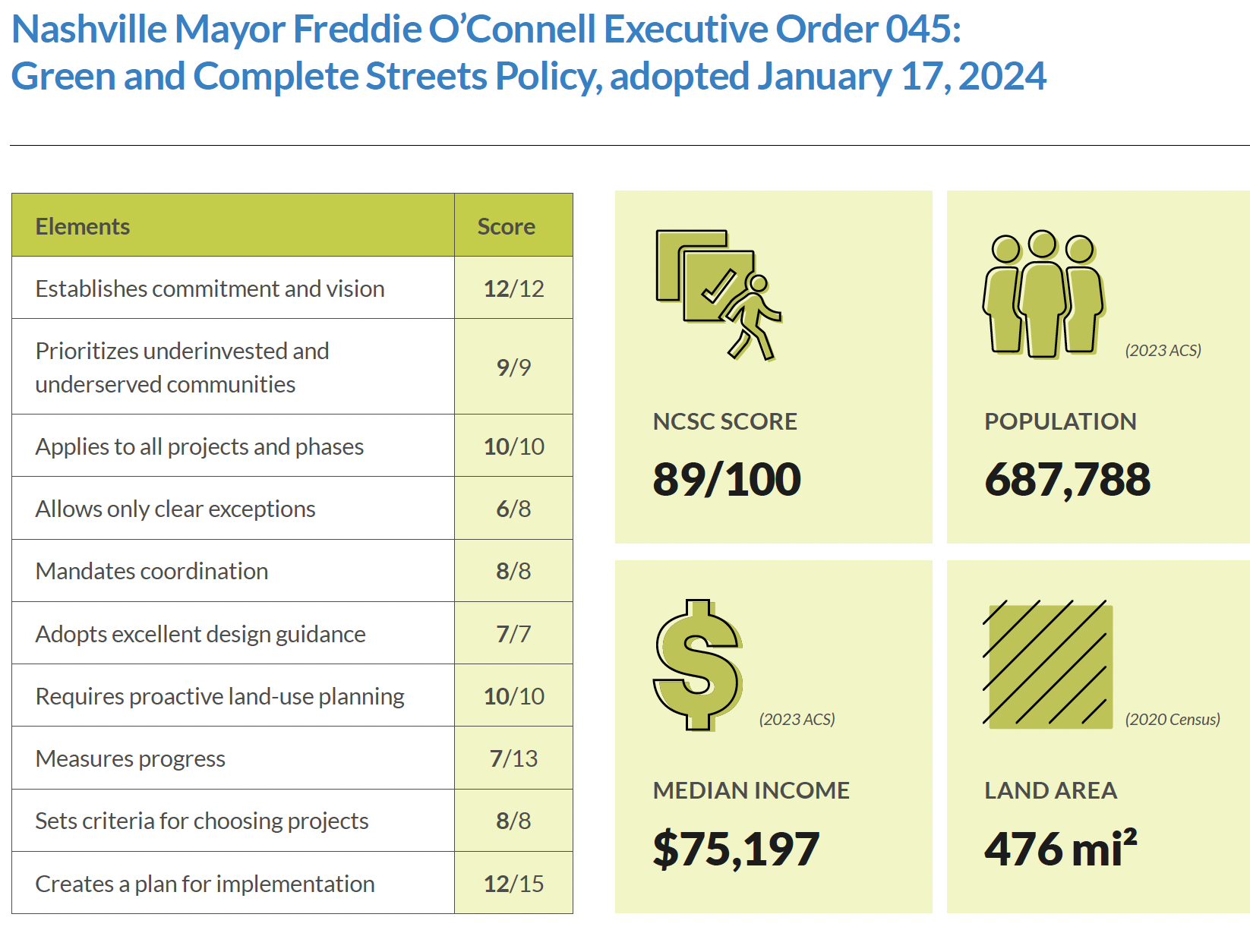 Nashville has passed multiple Complete Streets policies over the past fifteen years, improving them with each iteration. The Complete Streets policy passed by the city in 2024 is a testament to their efforts and could bolster the city’s progress in the years to come. Nashville shows how cities already making strides on Complete Streets can take their efforts further by refining and updating their policies.