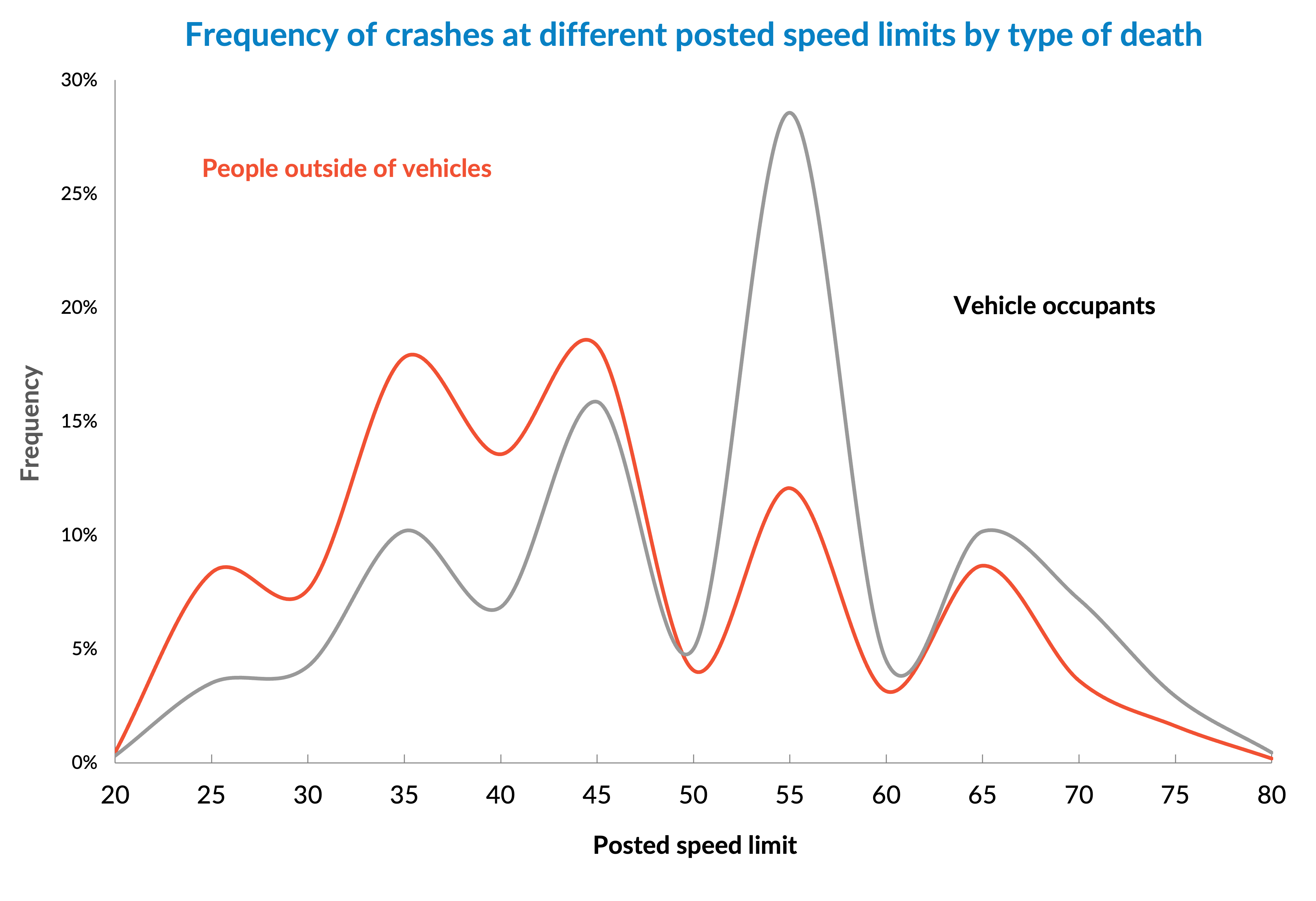 People in vehicles often die in high-speed crashes when speed limits are being ignored. Pedestrian deaths tend to occur on roads designed for moderate speeds, which typically keep drivers safe but do nothing for people on foot.