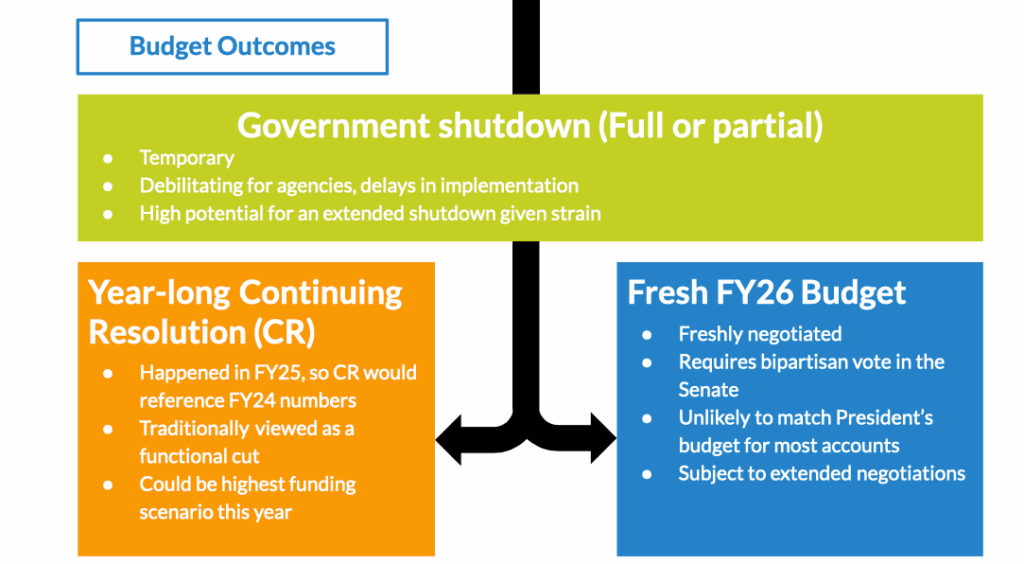 There are three likely paths forward in the coming weeks, with some hybrid of the three a fourth option: a sustained shutdown, a year-long continuing resolution, and the successful negotiation of a new FY26 budget. The shutdown seems likely to drag on for at least a few weeks, and a half-new-half-old funding situation could occur if Congress were to be able to successfully negotiate a new budget for a select group of agencies and accounts but fail to reach an agreement and have to go on a year-long continuing resolution for the remaining agencies (unlikely but not impossible). What actually happens will be dictated by the political will of each side in the negotiations–Democrats have made it clear they’d like to see some forward movement on healthcare negotiations as a requirement for their cooperation on funding, although the posture varies between members of Congress on what degree of movement might be enough to garner the votes needed to pass a government funding bill. There’s also some question of who voters blame for any pain they experience as a result of the shutdown and subsequent threatened cuts to federal government staffing. Democrats already lost three members of their caucus on last night’s government funding vote–Senators Fetterman, Cortez Masto, and King–and Republicans only need a handful more Democrats to join them to pass a bill.