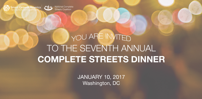 Join the National Complete Streets Coalition at our Seventh Annual Complete Streets Dinner, held on Tuesday, January 10, 2017 in Washington, DC. Conveniently scheduled during the 2017 Transportation Research Board meeting, this intimate and fun event brings together top Complete Streets professionals, policymakers, supporters, and friends to celebrate the successes of the Complete Streets movement in the last year.