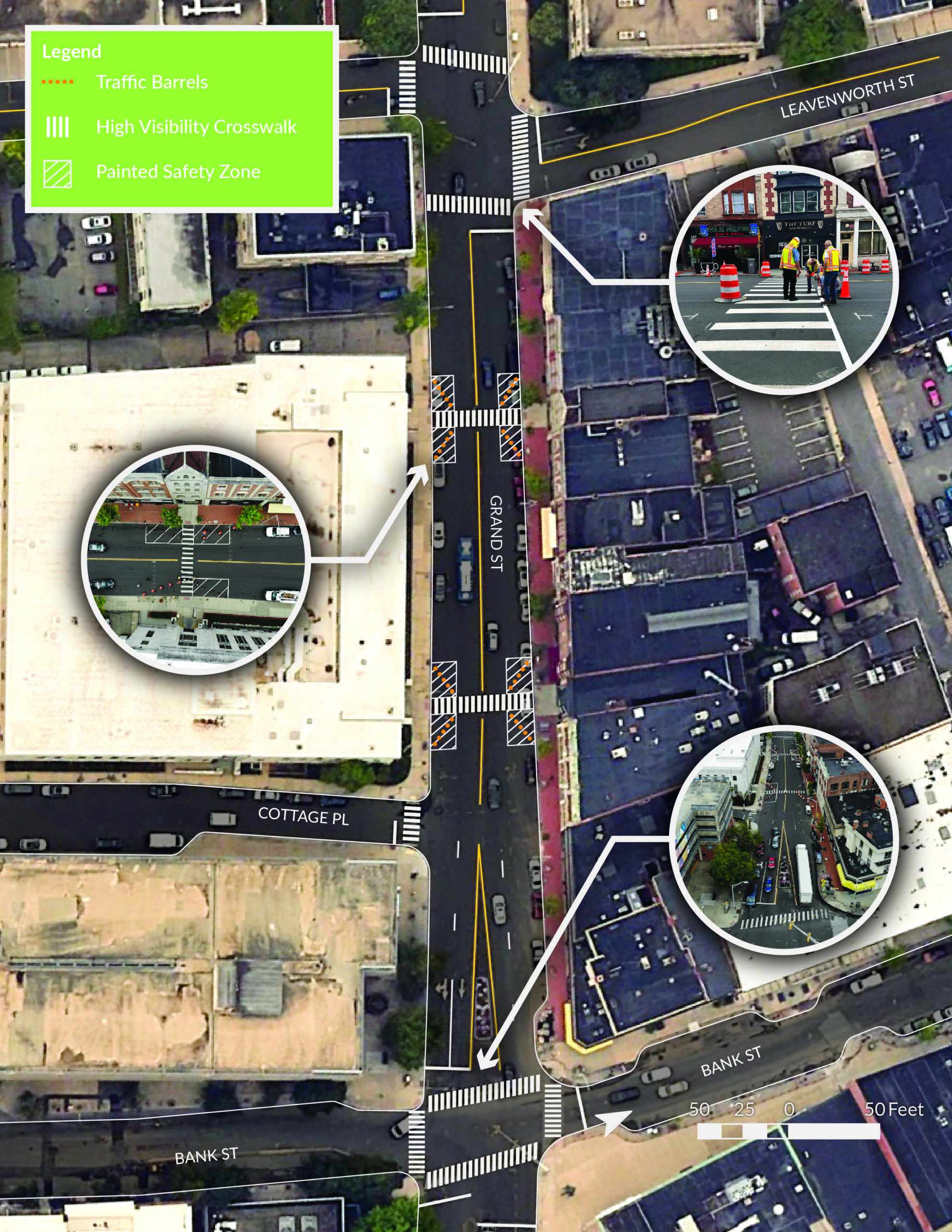 The Waterbury project shortened the crossing distance for pedestrians, narrowing travel lanes to 11.5’, and providing at least 25’ of no parking area on both sides of the crosswalks to improve visibility at intersections. Waterbury used barrels, traffic cones, and other easily moved materials to narrow lanes and improve crossing protection. They also increased the visibility of existing crosswalks with temporary paint and tape.