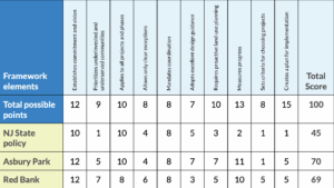 Red Bank and Asbury Park scored near equal or higher in almost every framework principle; they both do a good job of laying the groundwork for measuring progress of projects—something the statewide policy lacked in. They also both do a better job creating an implementation plan.