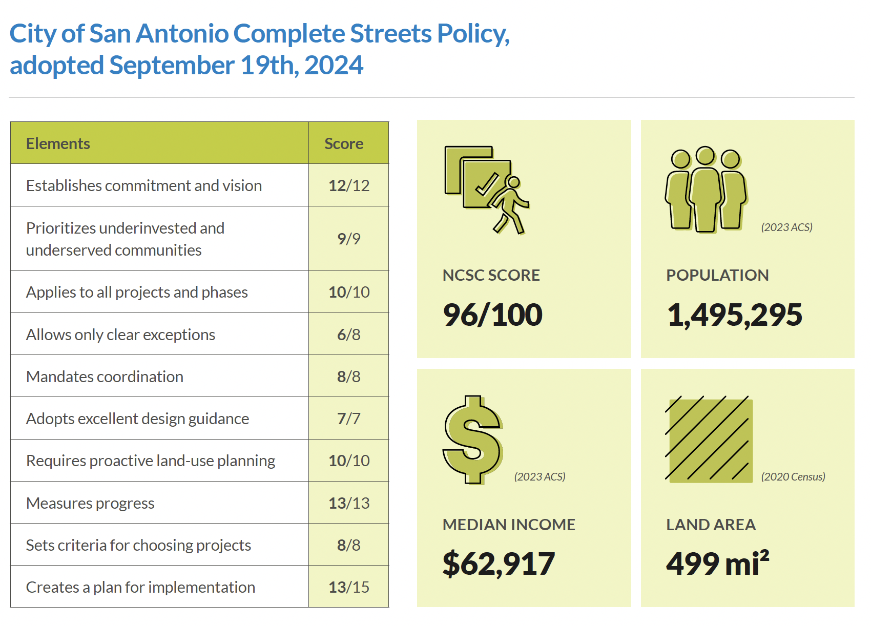 San Antonio’s Complete Streets Policy is the result of a year of deep collaboration among partners, including a coalition of dedicated Complete Streets champions. By working closely together to build consensus among community members and partners, the city updated its previous policy to better address the community’s needs with the necessary structure that can lead to improvements in how streets are built and maintained. The shared purpose of improving safety and comfort for all helped to maintain the momentum this robust team needed to pass a strong policy that scored very high according to our framework.