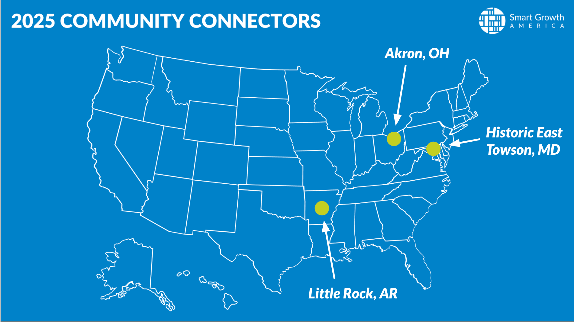 The 2025-2026 cohort includes Akron, Ohio with the Summit Lake Community Development Corporation Baltimore County, Maryland with the Northeast Towson Improvement Association of Historic East Towson, Little Rock, Arkansas with studioMAIN.